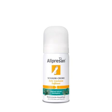 Prøv Allpresan Fodskumcreme i en helt særlig Limited Edition med eukalyptusekstrakt. Skummet giver intensiv pleje til meget tør og ru hud med 10% Carbamid, glycerin og biomimetiske lipider, som styrker hudbarrieren og reducerer hård hud.