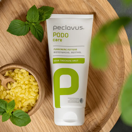 Peclavus® PODOcare fodcreme gør revnede, meget tørre fødder bløde igen. Intensivt nærende bivoks og det antibakterielle aktive ingredienskompleks af menthol og kamfer danner en solid beskyttende barriere og efterlader huden elastisk. Gennemprøvet og afprøvet i årtier. Certificeret naturkosmetik indeholder ikke paraffinolier.