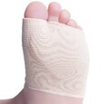 Det bløde og elastiske støttebind former sig behageligt om foden uden at stramme eller hæmme blodcirkulationen. Gelpuden ligger stabilt under forfoden og reducerer tryk, friktion og ømhed – både i sko og under bare fødder.