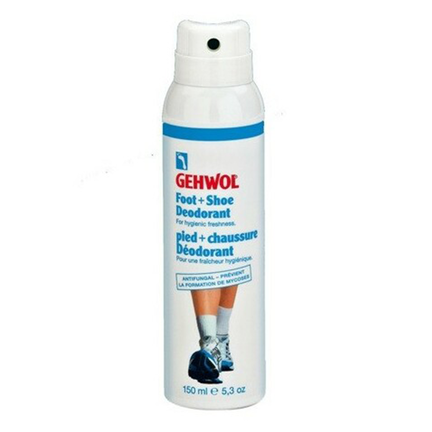 Spray Gehwol fod- og skodeodorant på rene fødder dagligt, og i skoene efter brug.