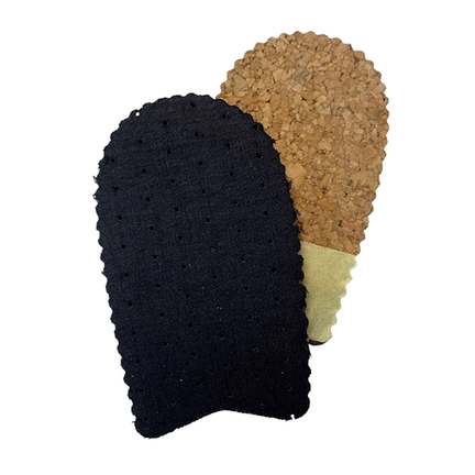Hælkilen er lavet af kork, beklædt med sort tekstil. På bagsiden er der et klistermærker, så den kan sættes fast i fodtøjet.